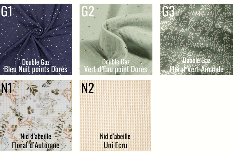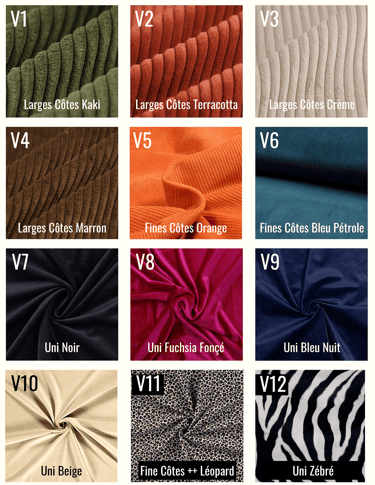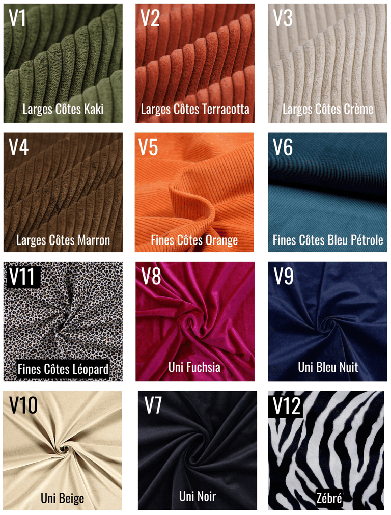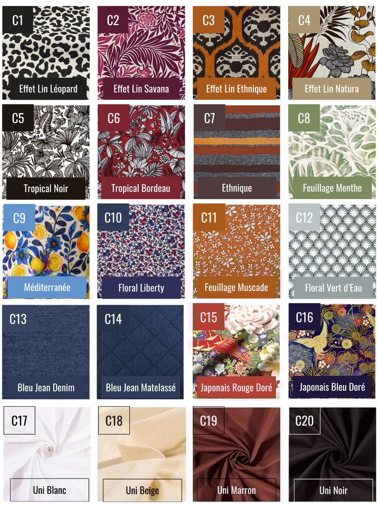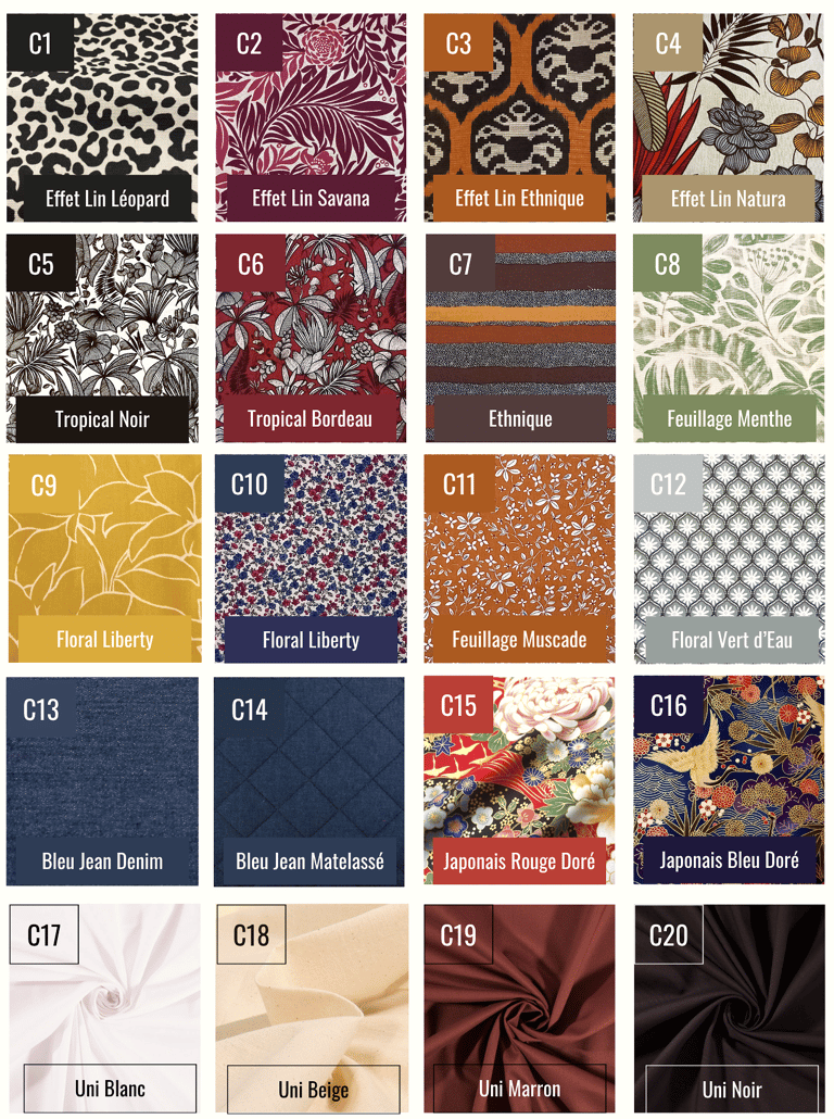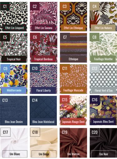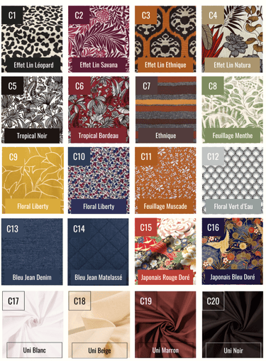 Choisissez vos tissus parmi notre large sélection et indiquez les codes associés lors de votre commande